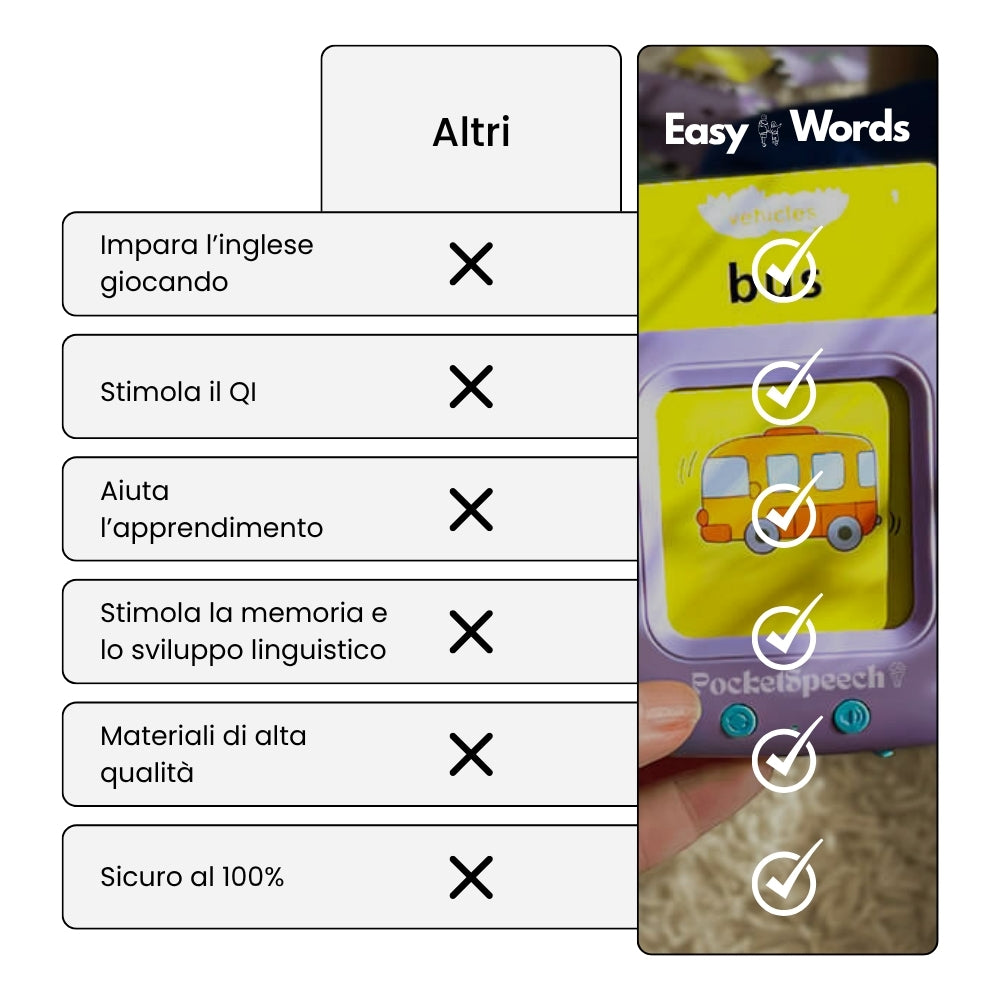 "Speech™ ha reso l’apprendimento un gioco per mia figlia! Adora come le card riproducono suoni e parole. Un ottimo modo per stimolare la sua curiosità e crescita linguistica!"